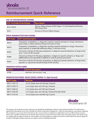 A handy quick guide that provides specific coding for diagnosis and administration as well as HCPCS and NDC codes for Venofer.